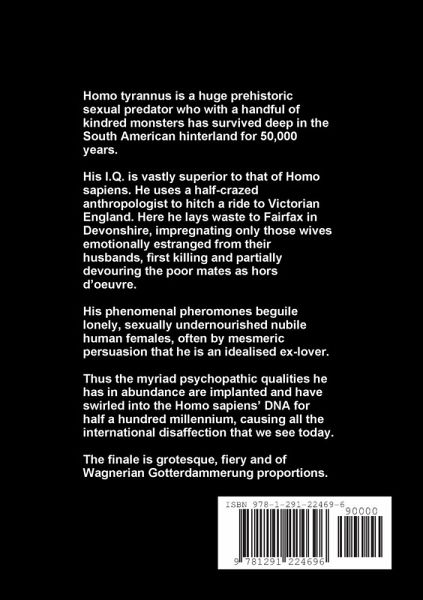 Homo tyrannus is a huge prehistoric sexual predator who with a handful of kindred monsters has survived deep in the South American hinterland for 50,000 years. His I.Q. is vastly superior to that of Homo sapiens. He uses a half-crazed anthropologist to hitch a ride to Victorian England. Here he lays waste to Fairfax in Devonshire, impregnating only those wives emotionally estranged from their husbands, fìrst killing and partially devouring the poor mates as hors d'oeuvre. His phenomenal pheromones beguile lonely, sexually undernourished nubile human females, often by mesmeric persuasion that he is an idealised ex-lover. Thus the myriad psychopathic qualities he has in abundance are implanted and have swirled into the Homo sapiens' DNA for half a hundred millennium, causing all the international disaffection that we see today. The finale is grotesque, fiery and of Wagnerian Gotterdammerun proportions