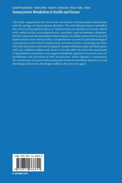 This book comprehensively reviews the association of homocysteine metabolism with the etiology of various human disorders. The well-defined chapters embedded the central and peripheral effects of homocysteine metabolism intricately related with cardiovascular, neurodegenerative, metabolic, and autoimmune disorders. Further, it discusses the mechanisms of perturbance of cellular proteostasis by elevated homocysteine levels and provides a comprehensive account of pathophysiological consequences and clinical implications of homocysteine-containing proteins. The book also reviews association of genetic variants of homocysteine metabolic genes with type 2 diabetes mellitus and obesity. It also describes the molecular mechanism of hyperhomocysteinemia in the negative/feedback regulation of neural stem cell proliferation and alterations in DNA methylation. Taken together, it summarizes the mechanisms of hyper homocysteinemia-induced endothelial dysfunction and physiological functions ofhydrogen sulfide as the protective agent.