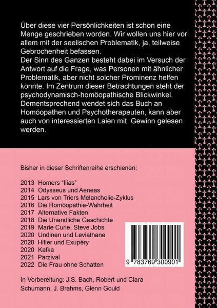 Über diese vier Persönlichkeiten ist schon eine Menge geschrieben worden. Wir wollen uns hier vor allem mit der seelischen Problematik, ja, teilweise Gebrochenheit befassen. Der Sinn des Ganzen besteht dabei im Versuch der Antwort auf die Frage, was Personen mit ähnlicher Problematik, aber nicht solcher Prominenz helfen könnte. Im Zentrum dieser Betrachtungen steht der psychodynamisch-homöopathische Blickwinkel. Dementsprechend wendet sich das Buch an Homöopathen und Psychotherapeuten, kann aber auch von interessierten Laien mit Gewinn gelesen werden.
