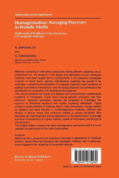 1. Formulation of Elementary Boundary Value Problems.- 1. The Concept of the Classical Formulation of a Boundary Value Problem for Equations with Discontinuous Coefficients.- 2. The Concept of Generalized Solution.- 3. Generalized Formulations of Problems for the Basic Equations of Mathematical Physics.- 2. The Concept of Asymptotic Expansion. A Model Example to Illustrate the Averaging Method.- 1. Asymptotic expansion. A Formal Asymptotic Solution.- 2. Asymptotic Expansion of a Solution of the Equation u = 1 + ?u3.- 3. Asymptotic Expansion of a Solution of the Equation (K(x/?)u?)?= f(x) by the Averaging Method.- 4. Generalization of the Averaging Method in the Case of a Piecewise Smooth Coefficient.- 5. Averaging the System of Differential Equations.- 3. Averaging Processes in Layered Media.- 1. Problem of Small Longitudinal Vibrations of a Rod.- 2. Nonstationary Problem of Heat Conduction.- 3. Averaging Maxwell Equations.- 4. Averaging Equations of a Viscoelastic Medium.- 5. Media with Slowly Changing Geometric Characteristics.- 6. Heat Transfer Through a System of Screens.- 7. Averaging a Nonlinear Problem of the Elasticity Theory in an Inhomogeneous Rod.- 8. The System of Equations of Elasticity Theory in a Layered Medium.- 9. Considerations Permitting Reduction of Calculations in Constructing Averaged Equations.- 10. Nonstationary Nonlinear Problems.- 11. Averaging Equations with Rapidly Oscillating Nonperiodic Coefficients.- 12. Problems of Plasticity and Dynamics of Viscous Fluid as Described by Functions Depending on Fast Variables.- 4. Averaging Basic Equations of Mathematical Physics.- 1. Averaging Stationary Thermal Fields in a Composite.- 2. Asymptotic Expansion of Solution of the Stationary Heat ConductionProblem.- 3. Stationary Thermal Field in a Porous Medium.- 4. Averaging a Stationary System of Equations of Elasticity Theory in Composite and Porous Materials.- 5. Nonstationary Systems of Equations of Elasticity and Diffusion Theory.- 6. Averaging Nonstationary Nonlinear System of Equations of Elasticity Theory.- 7. Averaging Stokes and Navier-Stokes Equations. The Derivation of the Percolation Law for a Porous Medium (Darcy's Law).- 8. Averaging in case of Short-Wave Propagation.- 9. Averaging the Transition Equation for a Periodic Medium.- 10. Eigenvalue Problems.- 5. General Formal Averaging Procedure.- 1. Averaging Nonlinear Equations.- 2. Averaged Equations of Infinite Order for a Linear Periodic Medium and for the Equation of Moment Theory.- 3. A Method of Describing Multi-Dimensional Periodic Media that does not Involve Separating Fast and Slow Variables.- 6. Properties of Effective Coefficients. Relationship Among Local and Averaged Characteristics of a Solution.- 1. Maintaining the Properties of Convexity and Symmetry of the Minimized Functional in Averaging.- 2. On the Principle of Equivalent Homogeneity.- 3. The Symmetry Properties of Effective Coefficients and Reduction of Periodic Problems to Boundary Value Problems.- 4. Agreement Between Theoretically Predicted Values of Effective Coefficients and Those Determined by an Ideal Experiment.- 7. Composite Materials Containing High-Modulus Reinforcement.- 1. The Stationary Field in a Layered Material.- 2. Composite Materials with Grains for Reinforcement.- 3. Dissipation of Waves in Layered Media.- 4. High-Modulus 3D Composite Materials.- 5. The Splitting Principle for the Averaged Operator for 3D High-Modulus Composites.- 8. Averaging of Processes in SkeletalStructures.- 1. An Example of Averaging a Problem on the Simplest Framework.- 2. A Geometric Model of a Framework.- 3. The Splitting Principle for the Averaged Operator for a Periodic Framework.- 4. The Splitting Principle for the Averaged Operator for Trusses and Thin-walled Structures.- 5. On Refining the Splitting Principle for the Averaged Operator.- 6 Asymptotic Expansion of a Solution of a Linear Equation in Partial Derivatives for a Rectangular Framework.- 7 Skeletal Structures with Random Properties.- 9. Mathematics of Boundary-Layer Theory in Composite Materials.- 1. Problem on the Contact of Two Layered Media.- 2. The Boundary Layer for an Elliptic Equation Defined on a Half-Plane.- 3. The Boundary Layer Near the Interface of Two Periodic Structures.- 4. Problem on the Contact of Two Media Divided by a Thin Interlayer.- 5. The Boundary Layer for the Nonstationary System of Equations of Elasticity Theory.- 6. On the Ultimate Strength of a Composite.- 7. Boundary Conditions of Other Types.- 8. On the Averaging of Fields in Layer Media with Layers of Composite Materials.- 9. The Time Boundary Layer for the Cauchy Parabolic Problem.- Supplement: Existence and Uniqueness Theorems for the Problem on a Cell.