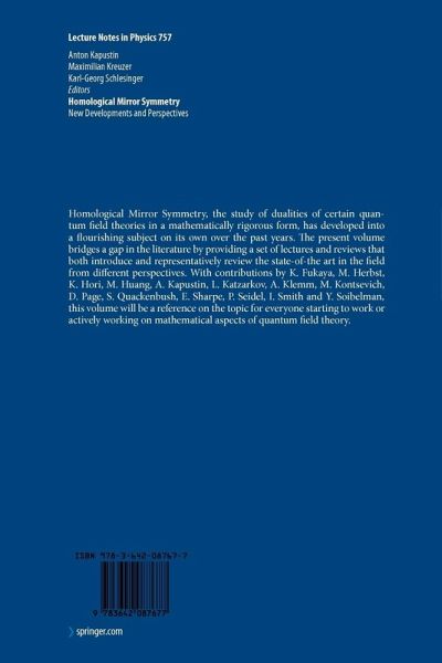 Homological Mirror Symmetry, the study of dualities of certain quantum field theories in a mathematically rigorous form, has developed into a flourishing subject on its own over the past years. The present volume bridges a gap in the literature by providing a set of lectures and reviews that both introduce and representatively review the state-of-the art in the field from different perspectives. With contributions by K. Fukaya, M. Herbst, K. Hori, M. Huang, A. Kapustin, L. Katzarkov, A. Klemm, M. Kontsevich, D. Page, S. Quackenbush, E. Sharpe, P. Seidel, I. Smith and Y. Soibelman, this volume will be a reference on the topic for everyone starting to work or actively working on mathematical aspects of quantum field theory.