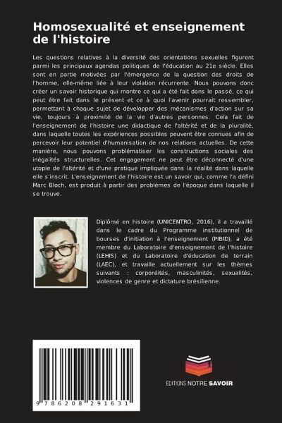 Les questions relatives à la diversité des orientations sexuelles figurent parmi les principaux agendas politiques de l'éducation au 21e siècle. Elles sont en partie motivées par l'émergence de la question des droits de l'homme, elle-même liée à leur violation récurrente. Nous pouvons donc créer un savoir historique qui montre ce qui a été fait dans le passé, ce qui peut être fait dans le présent et ce à quoi l'avenir pourrait ressembler, permettant à chaque sujet de développer des mécanismes d'action sur sa vie, toujours à proximité de la vie d'autres personnes. Cela fait de l'enseignement de l'histoire une didactique de l'altérité et de la pluralité, dans laquelle toutes les expériences possibles peuvent être connues afin de percevoir leur potentiel d'humanisation de nos relations actuelles. De cette manière, nous pouvons problématiser les constructions sociales des inégalités structurelles. Cet engagement ne peut être déconnecté d'une utopie de l'altérité et d'une pratique impliquée dans la réalité dans laquelle elle s'inscrit. L'enseignement de l'histoire est un savoir qui, comme l'a défini Marc Bloch, est produit à partir des problèmes de l'époque dans laquelle il se trouve.