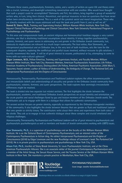 Homosexuality, Transsexuality, Psychoanalysis and Traditional Judaism explores the often incommensurable and irreconcilable beliefs and understandings of sexuality and gender in the Orthodox Jewish community from psychoanalytic, rabbinic, feminist, and queer perspectives. The book explores how seemingly irreconcilable differences might be resolved. ¿ The book is divided into two separate but related sections. The first highlights the divide between the psychoanalytic, academic, and traditional Orthodox Jewish perspectives on sexual identity and orientation, and the acute psychic and social challenges faced by gay and lesbian members of the Orthodox Jewish world. The contributors ask us to engage with them in a dialogue that allows for authentic conversation. The second section focuses on gender identity, especially as experienced by the Orthodox transgender members of the community. It also highlights the divide between theories that see gender as fluid and traditional Judaism that sees gender as strictly binary. The contributors write about their views and experiences from both sides of the divide. They ask us to engage in true authentic dialogue about these complex and crucial emotional and religious challenges.¿ Homosexuality, Transsexuality, Psychoanalysis and Traditional Judaism will be of great interest to psychoanalysts and psychoanalytic psychotherapists as well as members and leaders of Jewish communities working with LGBTQ issues.
