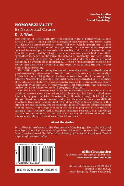 The subject of homosexuality, and especially male homosexuality, has received a great deal of publicity in England and America. The furor began with Kinsey's famous reports on sexual behavior, which brought out the fact that a far higher proportion of the population than was commonly supposed deviated from accepted standards of normality and morality. Taking courage from the apparent safety of large numbers, the sexually unorthodox and their sympathizers began to challenge the criteria of normality, and to question whether sexual habits that were widespread and so deeply entrenched could justifiably be written off as immoral. D.J. West's "Homosexuality" dissects the myths and paranoia surrounding this topic by examining the nature and roots of homosexuality.The politico-legal controversy has tended to overshadow the more fundamental psychological questions concerning the nature and causes of homosexuality. In this field, no striking discoveries have resulted from the increased public interest. Nevertheless, a body of factual data has accumulated, and a number of theories are available. The author's main purpose is to summarize as clearly as possible what is known, to draw what practical conclusions may be possible, and to point out where we are still groping and ignorant.This book deals mainly with male homosexuality because in men the condition causes more clear cut social problems and has been studied more intensely by psychiatrists. Unfortunately, though strongly held opinions abound, hard facts about homosexuality and its possible causes are difficult to obtain. Even now, serious medical and sociological investigations in this subject are scandalously few considering the importance of the questions in human terms. This resistance becomes acutely apparent when a social until a large section of the public is prepared to face the facts squarely and rationally and to support adequate research, our knowledge will remain rudimentary. This book clears away the debris of myth and misunderstanding in a vital area of social concern.