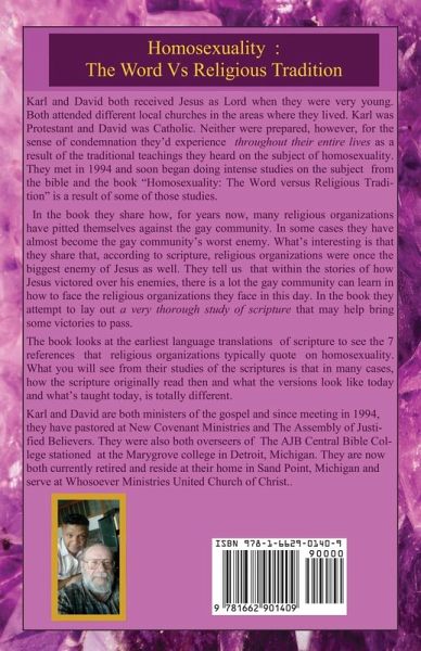 In this book Karl and David share how for many years now, many religious organizations have pitted themselves against the gay community. In some cases the church has become the gay community's worst enemy. Whats interesting is that they share that according to scripture, religious organizations were once the biggest enemy of Jesus as well. They tells us that within the stories of how Jesus victored over his enemy's there is a lot the gay community can learn in how to face the religious organizations they face in this day. In the book they attempt to lay out a very thorough study of scripture that may help bring some victories to pass . The book looks at the earliest language translations of scripture to see the 7 references that religious organizations typically quote on homosexuality. What you will see from their studies of scripture is that in many cases how the scripture originally read then and what the versions look like today and what's taught taught today , is totally different.