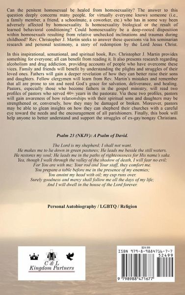 2025 Readers' Favorite Award -- 5-Star Seal Can the penitent homosexual be healed from homosexuality? The answer to this question deeply concerns many people, for virtually everyone knows someone (i.e., a family member, a friend, a schoolmate, a coworker, etc.) who has in some way been adversely affected by homosexuality. Is homosexuality biological or the result of learned behavioral conditioning? Could homosexuality be a deep-rooted disposition within homosexuals resulting from relative unchecked inclinations and traumas during childhood? Christopher J. Martin seeks to answer these questions via his seminarian research and personal testimony, a story of redemption by the Lord Jesus Christ. In this inspirational, sensational, and spiritual book, Rev. Christopher J. Martin provides something for everyone; all can benefit from reading it. It also presents research regarding alcoholism and drug addiction, providing accounts of people who have overcome these vices. Family and friends will benefit by understanding the plights and struggles of their loved ones. Fathers will gain a deeper revelation of how they can better raise their sons and daughters. Fellow clergymen will learn from Rev. Martin's mistakes and remember that all are prone to sin and need God's grace for salvation, deliverance, and healing. Pastors, especially those who become fathers in the gospel ministry, will read two profiles of pastors who served 40+ years in the pastorate. Via these two profiles, pastors will gain awareness of how relationships with their spiritual sons and daughters may be strengthened or, conversely, how they may be damaged or broken. Moreover, pastors may be able to glean insights on how they can shepherd their churches with a careful eye toward the needs and the encouragement of all parishioners. Finally, this book will help anyone to better understand and support the struggles of ex-gay/nongay Christians. (Visit CLKingdomPartners.com to read professional review articles and connect via social media.)