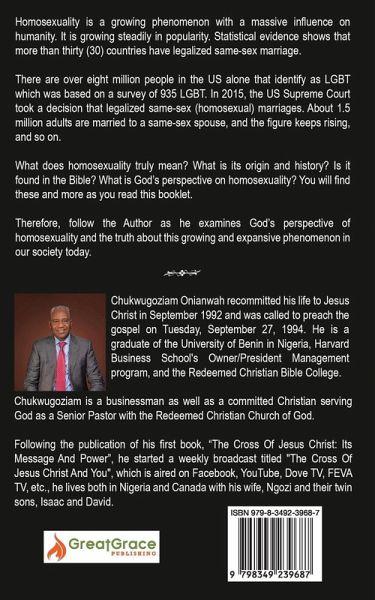 Homosexuality is a growing phenomenon with a massive influence on humanity. It is growing steadily in popularity. Statistical evidence shows that more than thirty (30) countries have legalized same-sex marriage.There are over eight million people in the US alone that identify as LGBT which was based on a survey of 935 LGBT. In 2015, the US Supreme Court took a decision that legalized same-sex (homosexual) marriages. About 1.5 million adults are married to a same-sex spouse, and the figure keeps rising, and so on.What does homosexuality truly mean? What is its origin and history? Is it found in the Bible? What is God's perspective on homosexuality? You will find these and more as you read this booklet.Therefore, follow the Author as he examines God's perspective of homosexuality and the truth about this growing and expansive phenomenon in our society today.