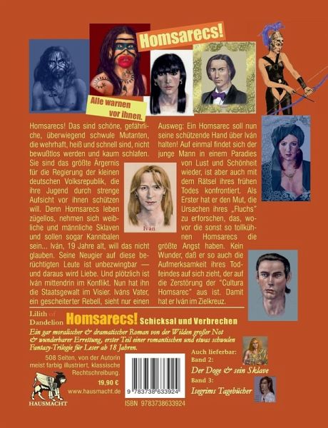 Band 1 der Serie "de Luxe/BDSM" -- Iván, 19 Jahre alt, langweilt sich in der kleinen spießigen Rechtsrepublik im Osten Deutschlands. Er interessiert sich brennend für die rebellischen und unbezwingbaren Homsarecs, der Inbegriff von Freiheit, Sex und Lebenslust. Sie sind pansexuelle Mutanten, schön, schnell, heiß wie Fiebernde, und sie haben scharfe Zähne. Sie fallen auch mit einer Kugel im Kopf nicht in Ohnmacht und schlafen kaum. Sie leben nach eigenen Gesetzen. Iván traut sich in ihr Haus und wird verwöhnt. Und plötzlich ist Iván mittendrin im Konflikt. Sein Vater, ein Regimegegner, sieht nur einen Ausweg: Ein Homsarec soll nun seine schützende Hand über Iván halten! Auf einmal ist dieser aber auch mit dem Rätsel ihres frühen Todes konfrontiert. Er forscht nach den Ursachen ihres kurzen Lebens. Kein Wunder, dass er so auch die Aufmerksamkeit ihres Todfeindes auf sich zieht, der auf die Zerstörung der Homsarec-Kultur aus ist. Er will diesem Volk zu Leibe rücken, und Iván soll unwissentlich das Werkzeug der Zerstörung werden.