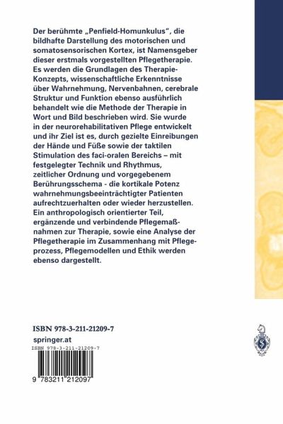 Der berühmte "Penfield-Homunkulus", die bildhafte Darstellung des motorischen und somatosensorischen Kortex, ist Namensgeber dieser erstmals vorgestellten Pflegetherapie. Es werden die Grundlagen des Therapie-Konzepts, wissenschaftliche Erkenntnisse über Wahrnehmung, Nervenbahnen, cerebrale Struktur und Funktion ebenso ausführlich behandelt wie die Methode der Therapie in Wort und Bild beschrieben wird. Sie wurde in der neurorehabilitativen Pflege entwickelt, und ihr Ziel ist es, durch gezielte Einreibungen der Hände und Füße sowie der taktilen Stimulation des faci-oralen Bereichs - mit festgelegter Technik und bestimmten Rhythmus, zeitlicher Ordnung und vorgegebenem Berührungsschema - die kortikale Potenz wahrnehmungsbeeinträchtigter Patienten aufrechtzuerhalten oder wieder herzustellen. Ein anthropologisch orientierter Teil, ergänzende und verbindende Pflegemaßnahmen zur Therapie sowie eine Analyse der Pflegetherapie im Zusammenhang mit Pflegeprozess, Pflegemodellen und Ethik werden ebenso dargestellt.