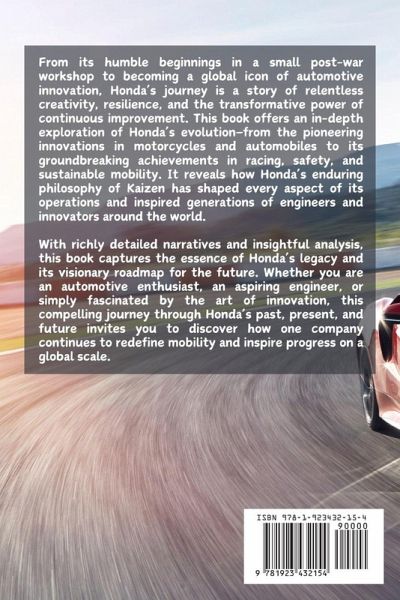 From its humble beginnings in a small post-war workshop to becoming a global icon of automotive innovation, Honda's journey is a story of relentless creativity, resilience, and the transformative power of continuous improvement. This book offers an in-depth exploration of Honda's evolution-from the pioneering innovations in motorcycles and automobiles to its groundbreaking achievements in racing, safety, and sustainable mobility. It reveals how Honda's enduring philosophy of Kaizen has shaped every aspect of its operations and inspired generations of engineers and innovators around the world. With richly detailed narratives and insightful analysis, this book captures the essence of Honda's legacy and its visionary roadmap for the future. Whether you are an automotive enthusiast, an aspiring engineer, or simply fascinated by the art of innovation, this compelling journey through Honda's past, present, and future invites you to discover how one company continues to redefine mobility and inspire progress on a global scale.
