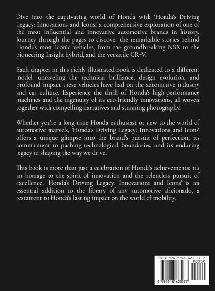 Dive into the captivating world of Honda with 'Honda's Driving Legacy: Innovations and Icons,' a comprehensive exploration of one of the most influential and innovative automotive brands in history. Journey through the pages to discover the remarkable stories behind Honda's most iconic vehicles, from the groundbreaking NSX to the pioneering Insight hybrid, and the versatile CR-V. Each chapter in this richly illustrated book is dedicated to a different model, unraveling the technical brilliance, design evolution, and profound impact these vehicles have had on the automotive industry and car culture. Experience the thrill of Honda's high-performance machines and the ingenuity of its eco-friendly innovations, all woven together with compelling narratives and stunning photography. Whether you're a long-time Honda enthusiast or new to the world of automotive marvels, 'Honda's Driving Legacy: Innovations and Icons' offers a unique glimpse into the brand's pursuit of perfection, its commitment to pushing technological boundaries, and its enduring legacy in shaping the way we drive. This book is more than just a celebration of Honda's achievements; it's an homage to the spirit of innovation and the relentless pursuit of excellence. 'Honda's Driving Legacy: Innovations and Icons' is an essential addition to the library of any automotive aficionado, a testament to Honda's lasting impact on the world of mobility.