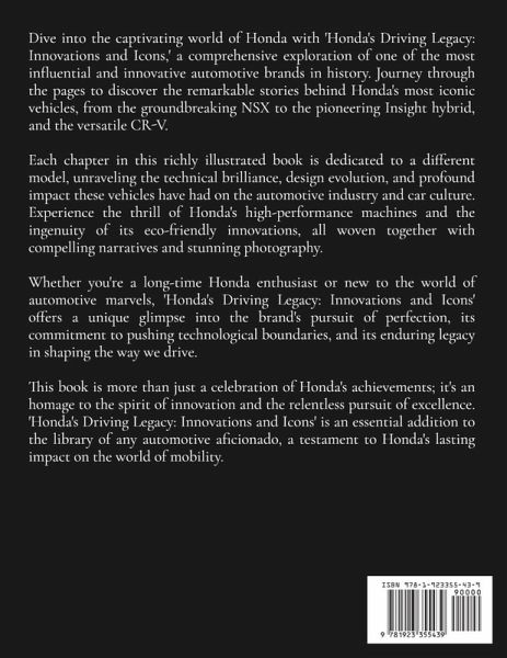 Dive into the captivating world of Honda with 'Honda's Driving Legacy: Innovations and Icons,' a comprehensive exploration of one of the most influential and innovative automotive brands in history. Journey through the pages to discover the remarkable stories behind Honda's most iconic vehicles, from the groundbreaking NSX to the pioneering Insight hybrid, and the versatile CR-V. Each chapter in this richly illustrated book is dedicated to a different model, unraveling the technical brilliance, design evolution, and profound impact these vehicles have had on the automotive industry and car culture. Experience the thrill of Honda's high-performance machines and the ingenuity of its eco-friendly innovations, all woven together with compelling narratives and stunning photography. Whether you're a long-time Honda enthusiast or new to the world of automotive marvels, 'Honda's Driving Legacy: Innovations and Icons' offers a unique glimpse into the brand's pursuit of perfection, its commitment to pushing technological boundaries, and its enduring legacy in shaping the way we drive. This book is more than just a celebration of Honda's achievements; it's an homage to the spirit of innovation and the relentless pursuit of excellence. 'Honda's Driving Legacy: Innovations and Icons' is an essential addition to the library of any automotive aficionado, a testament to Honda's lasting impact on the world of mobility.