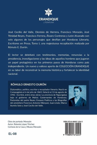 José Cecilio del Valle, Dionisio de Herrera, Francisco Morazán, José Trinidad Reyes, Francisco Ferrera, Álvaro Contreras y León Alvarado son solo algunos de los personajes que desfilan por Honduras Literaria, Escritores en Prosa, Tomo I, una majestuosa recopilación realizada por Rómulo E. Durón. El lector se deleitará con testimonios, memorias, renuncias a la presidencia, investigaciones y las ideas de aquellos hombres que jugaron un papel protagónico en los primeros pasos de Honduras como país independiente. Un nuevo y valioso aporte de COLECCIÓN ERANDIQUE en su labor de reconstruir la memoria histórica y fortalecer la identidad nacional.