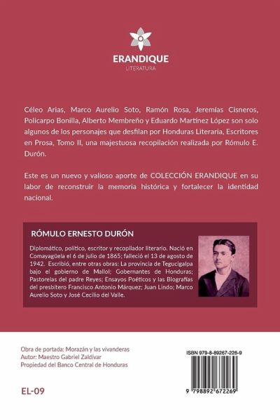 Céleo Arias, Marco Aurelio Soto, Ramón Rosa, Jeremías Cisneros, Policarpo Bonilla, Alberto Membreño y Eduardo Martínez López son solo algunos de los personajes que desfilan por Honduras Literaria, Escritores en Prosa, Tomo II, una majestuosa recopilación realizada por Rómulo E. Durón. Este es un nuevo y valioso aporte de COLECCIÓN ERANDIQUE en su labor de reconstruir la memoria histórica y fortalecer la identidad nacional.