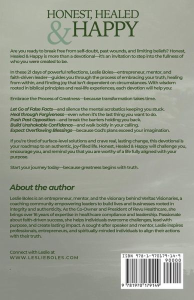 Are you ready to break free from self-doubt, past wounds, and the pressure to pretend everything's fine? Honest, Healed & Happy is a 21-day devotional designed to help you embrace your true self and walk confidently in your God-given purpose. If you've ever found yourself exhausted by trying to hold it all together while silently struggling inside, this book is your invitation to finally take off the mask-and heal. With gentle wisdom and bold encouragement, Leslie Boles-a seasoned entrepreneur, mentor, and faith-driven leader-guides you through a transformational journey of spiritual and emotional renewal. Blending biblical truth with real-world insight, each day's devotion provides a powerful reflection, personal growth challenge, and space to process what's been holding you back. You'll be equipped to:Embrace the Process of Greatness-because transformation takes time and intention. Let Go of False Facts-and silence the mental acrobatics keeping you stuck. Heal through Forgiveness-even when it's uncomfortable or undeserved. Push Past Opposition-and press forward with clarity and courage. Build Unshakable Confidence-and walk boldly in your divine assignment. Expect Overflowing Blessings-because God's promises go above and beyond. This is not a surface-level devotional-it's a soul-deep experience. Whether you're in a season of starting over, rediscovering your identity, or simply tired of going through the motions, Honest, Healed & Happy offers the breakthrough you've been praying for. Start your healing. Find your joy. And become the woman God always designed you to be.