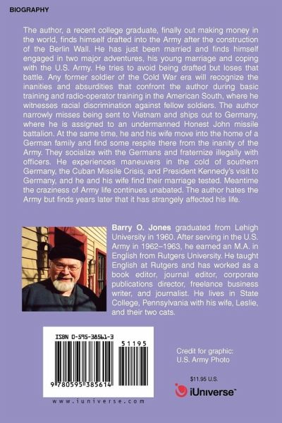 The author, a recent college graduate, finally out making money in the world, finds himself drafted into the Army after the construction of the Berlin Wall. He has just been married and finds himself engaged in two major adventures, his young marriage and coping with the U.S. Army. He tries to avoid being drafted but loses that battle. Any former soldier of the Cold War era will recognize the inanities and absurdities that confront the author during basic training and radio-operator training in the American South, where he witnesses racial discrimination against fellow soldiers. The author narrowly misses being sent to Vietnam and ships out to Germany, where he is assigned to an undermanned Honest John missile battalion. At the same time, he and his wife move into the home of a German family and find some respite there from the inanity of the Army. They socialize with the Germans and fraternize illegally with officers. He experiences maneuvers in the cold of southern Germany, the Cuban Missile Crisis, and President Kennedy's visit to Germany, and he and his wife find their marriage tested. Meantime the craziness of Army life continues unabated. The author hates the Army but finds years later that it has strangely affected his life.