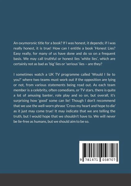 An oxymoronic title for a book? If I was honest, it depends; if I was really honest, it is true! How can I entitle a book 'Honest Lies? Easy really, for many of us have done and do so on a frequent basis. We may call truthful or honest lies 'white lies', which are certainly not as bad as 'big' lies or 'serious' lies - are they? I sometimes watch a UK TV programme called 'Would I lie to you?' where two teams must work out if the opposition are lying or not, from various statements being read out. As each team member is a celebrity, often comedians, or TV stars, there is quite a lot of amusing banter, role play and so on, but overall, it's surprising how 'good' some can lie! Though I don't recommend that we use the well-worn phrase 'Cross my heart and hope to die' as it just may come true! It may indicate that we are telling the truth, but I would hope that we shouldn't have to. We will never be lie-free as humans, but we should aim to be so.