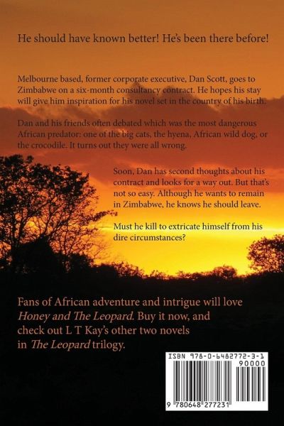 He should have known better. He's been there before. Melbourne based, former corporate executive, Dan Scott, goes to Zimbabwe on a six-month consultancy contract. He hopes his stay will give him inspiration for his novel set in the country of his birth. Dan and his friends often debated which was the most dangerous African predator: one of the big cats, the hyena, African wild dog, or the crocodile. It turns out they were all wrong. Soon, Dan has second thoughts about his contract and looks for a way out. But that's not so easy. Although he wants to remain in Zimbabwe, he knows he should leave. Must he kill to extricate himself from his dire circumstances? Fans of African adventure and intrigue will love Honey and The Leopard. Buy it now and check out L T Kay's other two novels in The Leopard Trilogy.