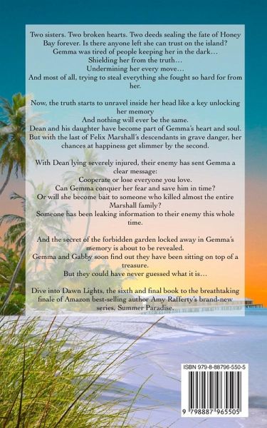 Is there anyone left she can trust on the island? Gemma was tired of people keeping her in the dark... Shielding her from the truth... Undermining her every move... And most of all, trying to steal everything she fought so hard for from her. Now, the truth starts to unravel inside her head like a key unlocking her memory... And nothing will ever be the same. Dean and his daughter have become part of Gemma's heart and soul. But with the last of Felix Marshall's descendants in grave danger, her chances at happiness get slimmer by the second. With Dean lying severely injured, their enemy has sent Gemma a clear message: Cooperate or lose everyone you love. Can Gemma conquer her fear and save him in time? Or will she become bait to someone who killed almost the entire Marshall family? Someone has been leaking information to their enemy this whole time. And the secret of the forbidden garden locked away in Gemma's memory is about to be revealed. Gemma and Gabby soon find out they have been sitting on top of a treasure. But they could have never guessed what it is... Dive into Dawn Lights, the breathtaking finale of Amazon best-selling author Amy Rafferty's Second Chance Beach Mystery series.
