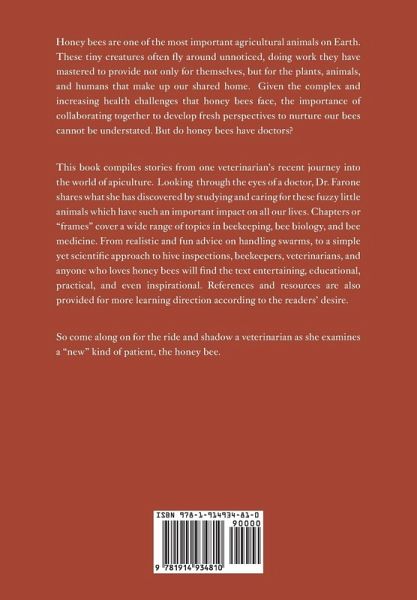 Honey bees are one of the most important agricultural animals on Earth. These tiny creatures often fly around unnoticed, doing work they have mastered to provide not only for themselves, but for the plants, animals, and humans that make up our shared home. Given the complex and increasing health challenges that honey bees face, the importance of collaborating together to develop fresh perspectives to nurture our bees cannot be understated. But do honey bees have doctors? This book compiles stories from one veterinarian's recent journey into the world of apiculture. Looking through the eyes of a doctor, Dr. Farone shares what she has discovered by studying and caring for these fuzzy little animals which have such an important impact on all our lives. Chapters or "frames" cover a wide range of topics in beekeeping, bee biology, and bee medicine. From realistic and fun advice on handling swarms, to a simple yet scientific approach to hive inspections, beekeepers, veterinarians, and anyone who loves honey bees will find the text entertaining, educational, practical, and even inspirational. References and resources are also provided for more learning direction according to the readers' desire. So come along on for the ride and shadow a veterinarian as she examines a "new" kind of patient, the honey bee.
