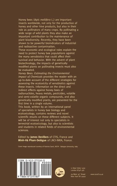 Honey Bees: Estimating the Environmental Impact of Chemicals is an updated account of the different strategies for assessing the ecotoxicity of xenobiotics against these social insects, which play a key role in both ecology and agriculture. In addition to the classical acute laboratory test, semi-field cage tests and full field funnel tests, new tests based mainly on behavioral responses are for the first time clearly described. Information on the direct and indirect effects on honey bees of radionuclides, heavy metals, pesticides, semi-volatile organic compounds and genetically modified plants is also presented.