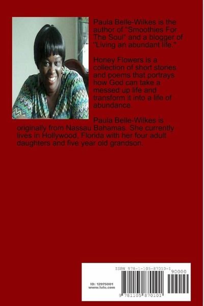 Paula Belle-Wilkes is a published author of "Smoothies For The Soul"and a blogger of "Living an abundant life" Honey Flowers is short stories and poems of her life. How God brought her from pain into joy, from a messed up life into a life of abundance. Paula Belle-Wilkes is originally from Nassau Bahamas but currently lived in Hollywood, her four adult daughters and five year old grandson.
