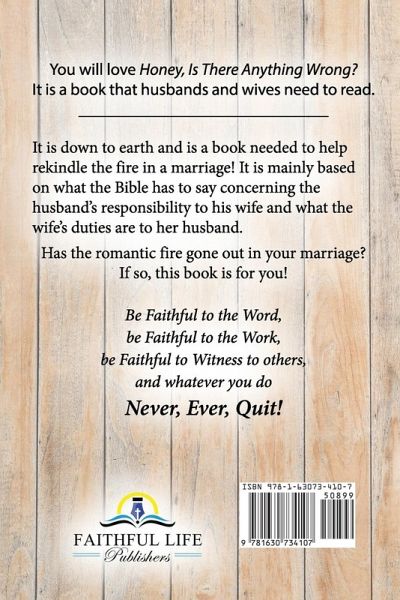 You will love Honey. Is There Anything Wrong? It is a book that husbands and wives need to read. It is down to earth and is a book needed to help rekindle the fire in a marriage! It is mainly based on what the Bible says concerning the husband's responsibility to his wife and what the wife's duties are to her husband. Has the romantic fire gone out in your marriage? If so, this book is for you!