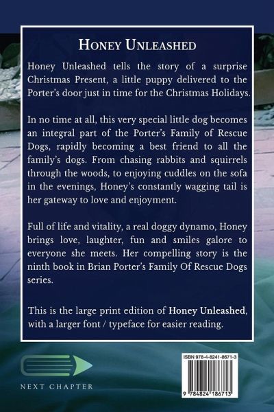 Honey Unleashed tells the story of a surprise Christmas Present, a little puppy delivered to the Porter's door just in time for the Christmas Holidays. In no time at all, this very special little dog becomes an integral part of the Porter's Family of Rescue Dogs, rapidly becoming a best friend to all the family's dogs. From chasing rabbits and squirrels through the woods, to enjoying cuddles on the sofa in the evenings, Honey's constantly wagging tail is her gateway to love and enjoyment. Full of life and vitality, a real doggy dynamo, Honey brings love, laughter, fun and smiles galore to everyone she meets. Her compelling story is the ninth book in Brian Porter's Family Of Rescue Dogs series. This is the large print edition of Honey Unleashed, with a larger font / typeface for easier reading.