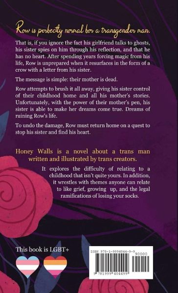 Row is perfectly normal for a transgender man. That is, if you ignore the fact his girlfriend talks to ghosts, his sister spies on him through his reflection, and that he has no heart. After spending years forcing magic from his life, Row is unprepared when it resurfaces in the form of a crow with a letter from his sister. The message is simple: their mother is dead. To undo the damage, Row must return home on a quest to stop his sister and find his heart. Honey Walls is a novel about a trans man written, illustrated, and narrated by trans creators.