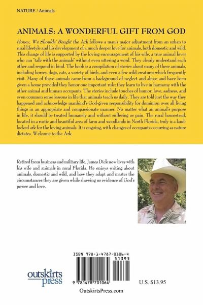 Honey, We Shoulda' Bought the Ark follows a man's major adjustment from an urban to rural lifestyle and his development of a much deeper love for animals, both domestic and wild. This change of life is supported by the loving encouragement of his wife, a true animal lover who can "talk with the animals" without even uttering a word. They clearly understand each other and respond in kind. The book is a compilation of stories about many of these animals, including horses, dogs, cats, a variety of birds, and even a few wild creatures which frequently visit. Many of these animals came from a background of neglect and abuse and have been given a home provided they honor one important rule: they learn to live in harmony with the other animal and human occupants. The stories include touches of humor, love, sadness, and even common sense lessons in life that animals teach us daily. They are told just the way they happened and acknowledge mankind's God-given responsibility for dominion over all living things in an appropriate and compassionate manner. No matter what an animal's purpose in life, it should be treated humanely and without suffering or pain. The rural homestead, located in a rustic and beautiful area of farm and woodlands in North Florida, truly is a land-locked ark for the loving animals. It is ongoing, with changes of occupants occurring as nature dictates. Welcome to the Ark.