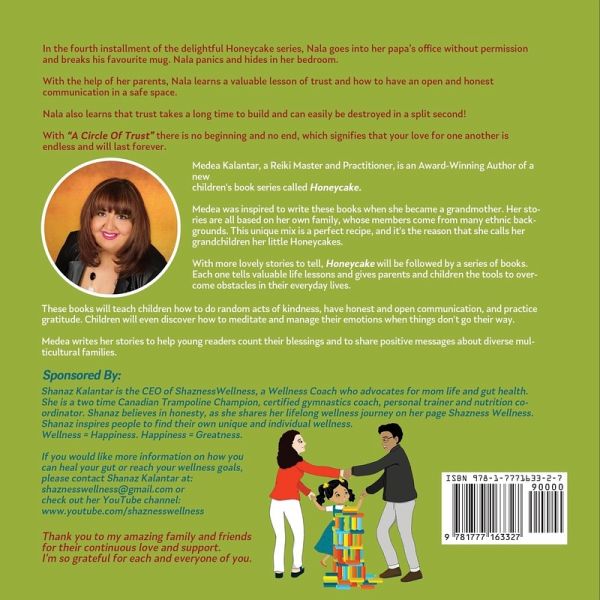 Honeycake: A Circle Of Trust - A Children's Picture Book About Building A Strong Foundation Of Trust Literary Titan Gold Winning Book Book Excellence Award Finalist The International Review of Books Badge Of Achievement With A Circle of Trust there is no beginning and no end, which signifies that your love for one another is endless and will last forever. "A Circle Of Trust" is a story with social emotional learning (SEL) in mind. It has been praised by parents and teachers worldwide. In the fourth installment of the delightful Honeycake series, Nala goes into her papa's office without permission and breaks his favourite mug. Nala panics and hides in her bedroom. With the help of her parents, Nala learns a valuable lesson of trust and how to have an open and honest communication in a safe space. Nala also learns that trust takes a long to build and can easily be destroyed in a split second! This book has a dual purpose, to enlighten children on the importance of trust and open communication as well as to educate parents on the vital need to create a safe space for children to open up from a young age. This book is also excellent for strengthening bonds between parents and children as they read it together and implement the lessons learnt in the story. Readers give this book and series a 5.0 out of 5 stars! FAMILY AND TRUST "This book affected me on several levels. First, the colorful appeal is very strong. The sunny palette of orange, red, turquoise, and yellow underscore this family story of warmth and caring. Second, the child's regret at breaking her father's favorite mug is conveyed realistically, and the unfolding of the incident serves to enforce a message of family unity and trust. I have not seen the previous Honeycake books, but since I am a grandmother, I certainly plan to check them out as potential gifts!" THE TRUTH WILL SET YOU FREE!!! "This is an amazing book. Trust, honesty and communication is essential characteristics of life. Honeycake talks about this very well. It's hard to trust, but this book talks about the value and the importance of trust as it relates to life. It is a wonderful lesson that will teach young people the value of trust. The author is absolutely talented. You have to buy this book. All kids will love it!" FABULOUS CONCEPT OF INCLUSION AND BELONGING "If you were ever looking for a book to increase a child's feeling of belonging and safety within the family dynamic, this is the one. A little girl worries about telling her family that she has broken something, which she is terribly upset about. But, with the help of a loving and supporting circle of trust, she is able to finally understand that there is always a safe space for her, to be honest, and open. A place of love and acceptance. A beautiful story" It's the perfect gift for all teachers and children, preschool through grade 3. It helps caregivers and educators start an age-appropriate conversation on the importance of honesty and open communication which will ultimately pave way for them to develop healthy relationships in life. Parents and Teachers Toolbox: Honeycake is an empowering series curated to empower young children to become aware of big emotions.