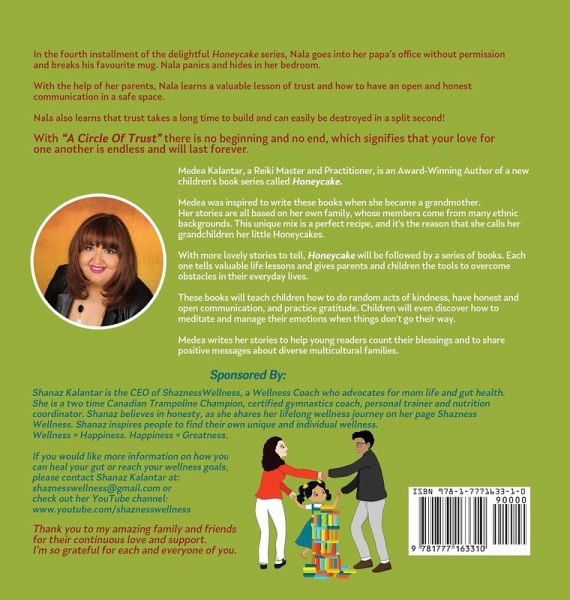 Honeycake: A Circle Of Trust - A Children's Picture Book About Building A Strong Foundation Of Trust Literary Titan Gold Winning Book Book Excellence Award Finalist The International Review of Books Badge Of Achievement With A Circle of Trust there is no beginning and no end, which signifies that your love for one another is endless and will last forever. "A Circle Of Trust" is a story with social emotional learning (SEL) in mind. It has been praised by parents and teachers worldwide. In the fourth installment of the delightful Honeycake series, Nala goes into her papa's office without permission and breaks his favourite mug. Nala panics and hides in her bedroom. With the help of her parents, Nala learns a valuable lesson of trust and how to have an open and honest communication in a safe space. Nala also learns that trust takes a long to build and can easily be destroyed in a split second! This book has a dual purpose, to enlighten children on the importance of trust and open communication as well as to educate parents on the vital need to create a safe space for children to open up from a young age. This book is also excellent for strengthening bonds between parents and children as they read it together and implement the lessons learnt in the story. Readers give this book and series a 5.0 out of 5 stars! FAMILY AND TRUST "This book affected me on several levels. First, the colorful appeal is very strong. The sunny palette of orange, red, turquoise, and yellow underscore this family story of warmth and caring. Second, the child's regret at breaking her father's favorite mug is conveyed realistically, and the unfolding of the incident serves to enforce a message of family unity and trust. I have not seen the previous Honeycake books, but since I am a grandmother, I certainly plan to check them out as potential gifts!" THE TRUTH WILL SET YOU FREE!!! "This is an amazing book. Trust, honesty and communication is essential characteristics of life. Honeycake talks about this very well. It's hard to trust, but this book talks about the value and the importance of trust as it relates to life. It is a wonderful lesson that will teach young people the value of trust. The author is absolutely talented. You have to buy this book. All kids will love it!" FABULOUS CONCEPT OF INCLUSION AND BELONGING "If you were ever looking for a book to increase a child's feeling of belonging and safety within the family dynamic, this is the one. A little girl worries about telling her family that she has broken something, which she is terribly upset about. But, with the help of a loving and supporting circle of trust, she is able to finally understand that there is always a safe space for her, to be honest, and open. A place of love and acceptance. A beautiful story" It's the perfect gift for all teachers and children, preschool through grade 3. It helps caregivers and educators start an age-appropriate conversation on the importance of honesty and open communication which will ultimately pave way for them to develop healthy relationships in life. Parents and Teachers Toolbox: Honeycake is an empowering series curated to empower young children to become aware of big emotions.