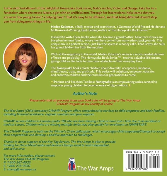 In the sixth installment of the delightful Honeycake book series, Nala's uncles, Victor and George, take her to a fundraiser where she meets Alexis, a girl with an artificial arm. Through her interactions, Nala learns that you are never too young to lend "a helping hand," that it's okay to be different, and that being different doesn't stop you from doing great things in life.
