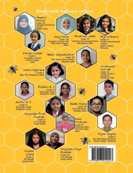Honeycomb Radiance - Short Stories for the Children, by the Children The Sixth Book in the Honeycomb Series Get enchanted as you read amazing and awe inspiring stories by young authors. Honeycomb Radiance is a vibrant collection of short stories written by children, for children. As the sixth book in the Honeycomb Series, this edition goes beyond storytelling to raise awareness about pressing global issues. From wildlife conservation and pollution to hunger, the quest for peace, from going on an adventure into space to deep in the blue ocean and into the crust layers of earth. These young authors use their creativity to spark meaningful conversations. Under the mentorship of Dr. Vajeda Kardar, these stories not only entertain but also inspire readers to think, reflect, and take action. A must-read for every young mind eager to explore stories that blend imagination with real-world concerns. Authors: Ryan Gupta, Inaya Khan, Muskaan Jalan, Pradynesh Gorade, Shrika KV, Myra Khare, Neha Vidyashankar, Saivi Prakash, Sayyada Ifrah Rushda, Naitik Ramji, Sanvi Agarwal, Feriha Soheb, Sayyada Inaya Rushda, Ridvika KV, Sofia Zahid, Abeera Khirad