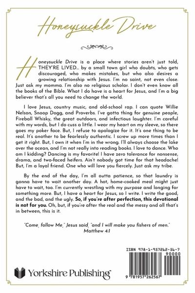 Honeysuckle Drive is a place where stories aren't just told, they're lived...by a small town girl who doubts, who gets discouraged, who makes mistakes, but who also desires a growing relationship with Jesus. I'm no saint, not even close. Just ask my momma. I'm also no religious scholar. I don't even know all the books of the Bible. What I do have is a heart for Jesus, and I'm a big believer that's all you need to change the world.