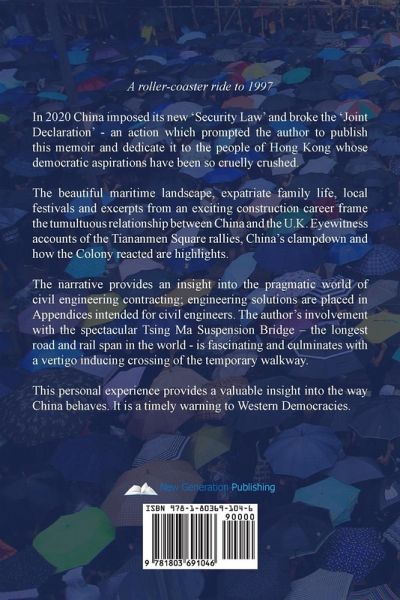 A roller-coaster ride to 1997 In 2020 China imposed its new 'Security Law' and broke the 'Joint Declaration' - an action which prompted the author to publish this memoir and dedicate it to the people of Hong Kong whose democratic aspirations have been so cruelly crushed. The beautiful maritime landscape, expatriate family life, local festivals and excerpts from an exciting construction career frame the tumultuous relationship between China and the U.K. Eyewitness accounts of the Tiananmen Square rallies, China's clampdown and how the Colony reacted are highlights. The narrative provides an insight into the pragmatic world of civil engineering contracting; engineering solutions are placed in Appendices intended for civil engineers. The author's involvement with the spectacular Tsing Ma Suspension Bridge - the longest road and rail span in the world - is fascinating and culminates with a vertigo inducing crossing of the temporary walkway. This personal experience provides a valuable insight into the way China behaves. It is a timely warning to Western Democracies.