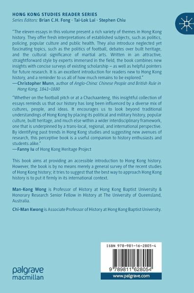 1. Politics and Public Administration.- 2. Military History.- 3. Policing.- 4. Cold War and Decolonisation.- 5 Built Heritage.- 6. China's Intellectuals and Chinese Culture in Hong Kong.- 7. Culture and Identity.- 8. Re-thinking Popular Culture.- 9. Football.- 10. Chinese Martial Arts.- 11. Public Health and Infectious Diseases (1842-1970).