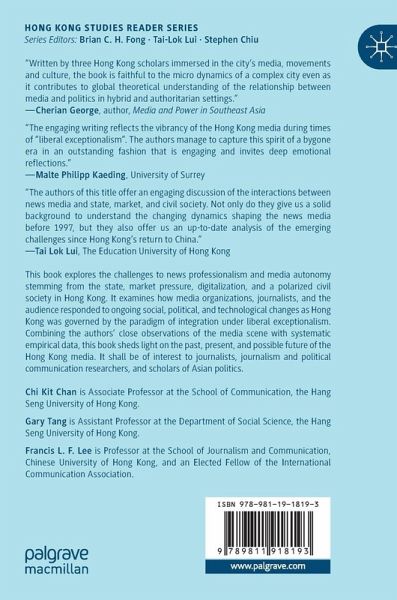 This book explores the challenges to news professionalism and media autonomy stemming from the state, market pressure, the digitalization of communication, and a polarized civil society in Hong Kong. China is tightening its control over post-handover Hong Kong, which includes press freedom. Harsh market competition, coupled with shifting readership from mainstream media to digital platforms, is squeezing the business viability of media organizations. The polarization of civil society in post-handover Hong Kong had degraded consensual values upon which news professionalism relies. Journalists have had to reorient news professionalism and media power in the midst of state-society tension, market pressure, and the shifting communication mode driven by digitalization. These are the key questions for Hong Kong media. This dynamic intervention will be of interest to journalists, scholars of civil society, and scholars of Asian politics.