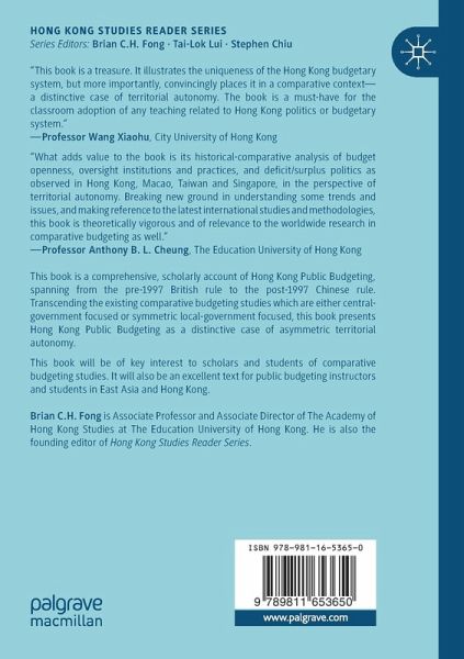 This book is a comprehensive, scholarly account of Hong Kong Public Budgeting, spanning from the pre-1997 British rule to the post-1997 Chinese rule. Transcending the existing comparative budgeting studies which are either central-government focused or symmetric local-government focused, this book presents Hong Kong Public Budgeting as a distinctive case of territorial autonomy.