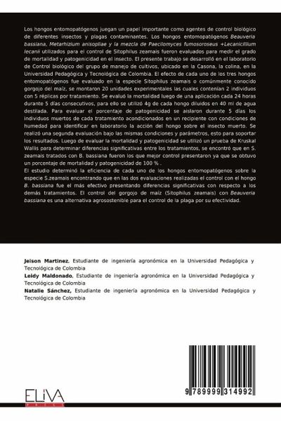 Los hongos entomopatógenos juegan un papel importante como agentes de control biológico de diferentes insectos y plagas contaminantes. Los hongos entomopatógenos Beauveria bassiana, Metarhizium anisopliae y la mezcla de Paecilomyces fumosoroseus +Lecanicillium lecanii utilizados para el control de Sitophilus zeamais fueron evaluados para medir el grado de mortalidad y patogenicidad en el insecto. El presente trabajo se desarrolló en el laboratorio de Control biológico del grupo de manejo de cultivos, ubicado en la Casona, la colina, en la Universidad Pedagógica y Tecnológica de Colombia. El efecto de cada uno de los tres hongos entomopatógenos fue evaluado en la especie Sitophilus zeamais o comúnmente conocido gorgojo del maíz, se montaron 20 unidades experimentales las cuales contenían 2 individuos con 5 réplicas por tratamiento. Se evaluó la mortalidad luego de una aplicación cada 24 horas durante 5 días consecutivos, para ello se utilizó 4g de cada hongo diluidos en 40 ml de agua destilada. Para evaluar el porcentaje de patogenicidad se aislaron durante 5 días los individuos muertos de cada tratamiento acondicionados en un recipiente con condiciones de humedad para identificar en laboratorio la acción del hongo sobre el insecto muerto. Se realizó una segunda evaluación bajo las mismas condiciones y parámetros, esto para soportar los resultados. Luego de evaluar la mortalidad y patogenicidad se utilizó un prueba de Kruskal Wallis para determinar diferencias significativas entre los tratamientos, se encontró que en S. zeamais tratados con B. bassiana fueron los que mejor control presentaron ya que se obtuvo un porcentaje de mortalidad y patogenicidad de 100 % . El estudio determinó la eficiencia de cada uno de los hongos entomopatógenos sobre la especie S.zeamais encontrando que en las dos evaluaciones realizadas el control con el hongo B. bassiana fue el más efectivo presentando diferencias significativas con respecto a los demás tratamientos. El control del gorgojo de maíz (Sitophilus zeamais) con Beauveria bassiana es una alternativa agrosostenible para el control de la plaga por su efectividad.