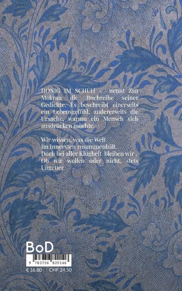Honig im Schuh - nennt Zan Mokran die Buchreihe seiner Gedichte. Es beschreibt einerseits ein Lebensgefühl, andererseits die Ursache, warum ein Mensch sich ausdrücken möchte. Wir wissen, was die WeltIm Innersten zusammenhält.Doch bei aller Klugheit bleiben wir,Ob wir wollen oder nicht, stets Ungetier.
