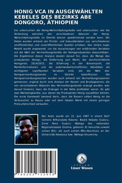 Sie untersuchen die Honig-Wertschöpfungskette und untersuchen, wie die Verbindung zwischen den verschiedenen Akteuren der Honig-Wertschöpfungskette im Distrikt besser gewährleistet werden kann. Die Daten wurden anhand von Primär- und Sekundärdaten aus verschiedenen veröffentlichten und unveröffentlichten Quellen erhoben. Das binäre Logit-Modell wurde angewandt, um die Auswirkungen von erklärenden Variablen auf die Wahl der Vermarktungskanäle der Honigproduzenten abzuschätzen. Die Ergebnisse dieser Analyse deuten darauf hin, dass die Menge des produzierten Honigs, die Entfernung zum Markt, der durchschnittliche Honigpreis 2014/2015, die Erfahrung in der Bienenzucht, die Marktinformationen und die außerlandwirtschaftlichen Aktivitäten die wichtigsten signifikanten Variablen sind, die die Wahl des Honigvermarktungskanals im Distrikt beeinflussen. Die Honigvermarktungskosten wurden auch anhand von Vermarktungsspannen gemessen, ergänzt durch eine Analyse der Kosten und Bruttogewinne, die von verschiedenen Akteuren des Vermarktungskanals erzeugt wurden, was darauf hinweist, dass die Erzeuger in der Kette profitabler waren. Es gibt zwei Marketingkanäle, aus denen die Produzenten Honig auswählen können. Die erste Kanalwahl bestand darin, dass die Bauern selbst Honig an die Verbraucher zu Hause oder auf dem lokalen Markt mit einem geringen Preisunterschied verkaufen.