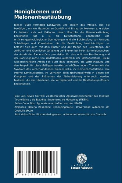 Dieses Buch vermittelt Landwirten und Imkern das Wissen, das sie benötigen, um ein Maximum an Qualität und Ertrag bei Melonen zu erzielen. Es befasst sich mit Faktoren, deren Kontrolle die Bienenbestäubung beeinflusst, wie z. B. die Kulturführung, edaphische und ernährungsphysiologische Überlegungen und die Bekämpfung von Unkraut, Schädlingen und Krankheiten, die die Bestäubung beeinträchtigen; es befasst sich auch mit dem Muster und der Menge des Pollenfangs, der zeitlichen und räumlichen Verteilung der Bienen bei ihren Sammelbesuchen, der Anzahl der Bienenstöcke pro Hektar für eine optimale Bestäubung und der Nahrungssuche von Wildpflanzen außerhalb der Melonenpflanze. Diese wissenschaftliche Arbeit soll auch dazu beitragen, die Wertschätzung und den Respekt für diese fleißigen Insekten zu erhöhen, indem Themen wie das Syndrom des verschwindenden Bienenstocks, ihr Gemeinschaftsleben, ihre interne Kommunikation, ihr Verhalten beim Nahrungserwerb in Zeiten der Knappheit und das Phänomen der Afrikanisierung untersucht werden, Faktoren, die das Überleben, die Verfügbarkeit und die Bestäubungseffizienz beeinflussen.