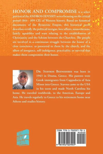 HONOR AND COMPROMISE is a select portion of the ANDROS ODYSSEY series focusing on the critical period (864 - 899 CE) of Western history. Based on historical documents of the Byzantine Empire, this historical novel describes vividly the political intrigue, love affairs, assassinations, family squabbles and wars relating to the establishment of Christianity and the Schism between the Churches. The people are involved in a continuous struggle between the honor of a clear conscience, as presented to them by the church, and the allure of arrogance, self-indulgence, practicality, or survival that makes them compromise their honor.
