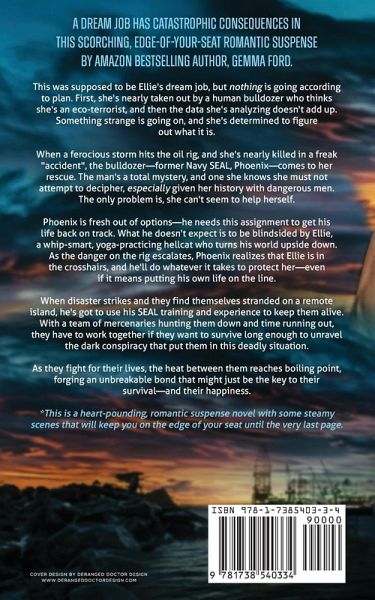 A dream job has catastrophic consequences in this scorching, edge-of-your-seat romantic suspense by Amazon bestselling author, Gemma Ford. This was supposed to be Ellie's dream job, but nothing is going according to plan. First, she's nearly taken out by a human bulldozer who thinks she's an eco-terrorist, and then the data she's analyzing doesn't add up. Something strange is going on, and she's determined to figure out what it is. When a ferocious storm hits the oil rig, and she's nearly killed in a freak "accident", the bulldozer-former Navy SEAL, Phoenix-comes to her rescue. The man's a total mystery, and one she knows she must not attempt to decipher, especially given her history with dangerous men. The only problem is, she can't seem to help herself. Phoenix is fresh out of options-he needs this assignment to get his life back on track. What he doesn't expect is to be blindsided by Ellie, a whip-smart, yoga-practicing hellcat who turns his world upside down. As the danger on the rig escalates, Phoenix realizes that Ellie is in the crosshairs, and he'll do whatever it takes to protect her-even if it means putting his own life on the line. When disaster strikes and they find themselves stranded on a remote island, he's got to use his SEAL training and experience to keep them alive. With a team of mercenaries hunting them down and time running out, they have to work together if they want to survive long enough to unravel the dark conspiracy that put them in this deadly situation. As they fight for their lives, the heat between them reaches boiling point, forging an unbreakable bond that might just be the key to their survival-and their happiness. *This is a heart-pounding, romantic suspense novel with some steamy scenes that will keep you on the edge of your seat until the very last page.