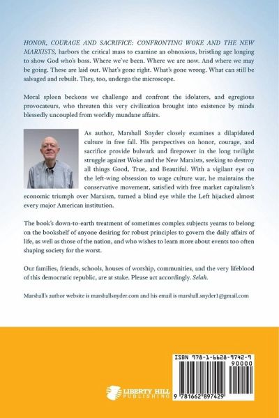 HONOR, COURAGE AND SACRIFICE: CONFRONTING WOKE AND THE NEW MARXISTS, harbors the critical mass to examine an obnoxious, bristling age longing to show God who's boss. Where we've been. Where we are now. And where we may be going. These are laid out. What's gone right. What's gone wrong. What can still be salvaged and rebuilt. They, too, undergo the microscope. Moral spleen beckons we challenge and confront the idolaters, and egregious provocateurs, who threaten this very civilization brought into existence by minds blessedly uncoupled from worldly mundane affairs. As author, Marshall Snyder closely examines a dilapidated culture in free fall. His perspectives on honor, courage, and sacrifice provide bulwark and firepower in the long twilight struggle against Woke and the New Marxists, seeking to destroy all things Good, True, and Beautiful. With a vigilant eye on the left-wing obsession to wage culture war, he maintains the conservative movement, satisfied with free market capitalism's economic triumph over Marxism, turned a blind eye while the Left hijacked almost every major American institution. The book's down-to-earth treatment of sometimes complex subjects yearns to belong on the bookshelf of anyone desiring for robust principles to govern the daily affairs of life, as well as those of the nation, and who wish to learn more about events too often shaping society for the worst. Our families, friends, schools, houses of worship, communities, and the very lifeblood of this democratic republic, are at stake. Please act accordingly. Selah.