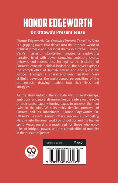 "Honor Edgeworth: Or, Ottawa's Present Tense" by Vera is a gripping novel that delves into the intricate world of political intrigue and personal drama in Ottawa, Canada. Vera's masterful storytelling creates a captivating narrative filled with power struggles, ambition, loyalty, betrayal, and redemption. Set against the backdrop of Ottawa's dynamic political landscape, the novel explores the complexities of human nature and the quest for justice. Through a character-driven narrative, Vera skillfully develops the multifaceted personalities of the protagonists, drawing readers into their lives and struggles. As the story unfolds, the intricate web of relationships, ambitions, and moral dilemmas keeps readers on the edge of their seats, eagerly turning pages to uncover the next twist in the plot. With its richly detailed portrayal of Ottawa and its inhabitants, "Honor Edgeworth: Or, Ottawa's Present Tense" offers readers a compelling glimpse into the inner workings of politics and the human spirit. Vera's novel is a must-read for those who enjoy tales of intrigue, power, and the complexities of morality in the pursuit of justice.
