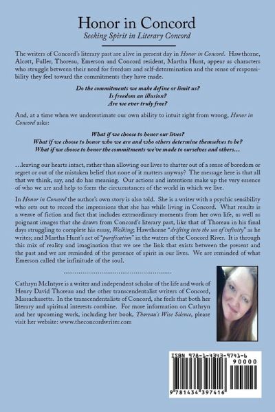 The writers of Concord, Massachusetts' literary past are alive in present day in Honor in Concord. They appear as characters who struggle between their need for freedom and self-determination and the sense of responsibility they feel toward the commitments they have made. Do the commitments we make define or limit us? Is freedom and illusion? Are we ever truly free? Honor in Concord also asks: What if we choose to honor our lives? What if we choose to honor who we are and who others determine themselves to be? What if we choose to honor the commitments we've made to ourselves and others leaving our hearts intact, rather than allowing our lives to shatter out of a sense of boredom or regret or out of the mistaken belief that none of it matters anyway? The message here is that all that we think, say, and do has meaning. Our actions and intentions make up the very essence of who we are and help to form the circumstances of the world in which we live. Honor in Concord presents a weave of fiction and fact that includes extraordinary moments from the author's own life, as well as poignant images that she draws from Concord's literary past, like that of Thoreau in his final days struggling to complete his essay, Walking; Hawthorne "drifting into the sea of infinity" as he writes; and Martha Hunt's act of "purification" in the waters of the Concord River. It is through this mix of reality and imagination that we see the link that exists between the present and the past and we are reminded of the presence of spirit in our lives. We are reminded of what Emerson called the infinitude of the soul.