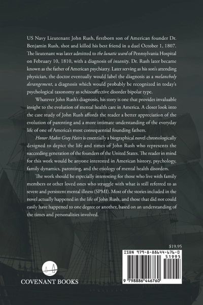 US Navy Lieutenant John Rush, firstborn son of American founder Dr. Benjamin Rush, shot and killed his best friend in a duel October 1, 1807. The lieutenant was later admitted to the lunatic ward of Pennsylvania Hospital on February 10, 1810, with a diagnosis of insanity. Dr. Rush later became known as the father of American psychiatry. Later serving as his son's attending physician, the doctor eventually would label the diagnosis as a melancholy derangement, a diagnosis which would probably be recognized in today's psychological taxonomy as schizoaffective disorder bipolar type. Whatever John Rush's diagnosis, his story is one that provides invaluable insight to the evolution of mental health care in America. A closer look into the case study of John Rush affords the reader a better appreciation of the evolution of parenting and a more intimate understanding of the everyday life of one of America's most consequential founding fathers. Honor Makes Gray Hairs is essentially a biographical novel chronologically designed to depict the life and times of John Rush who represents the succeeding generation of the founders of the United States. The reader in mind for this work would be anyone interested in American history, psychology, family dynamics, parenting, and the etiology of mental health disorders. The work should be especially interesting for those who live with family members or other loved ones who struggle with what is still referred to as severe and persistent mental illness (SPMI). Most of the stories included in the novel actually happened in the life of John Rush, and those that did not could easily have happened to one degree or another, based on an understanding of the times and personalities involved.