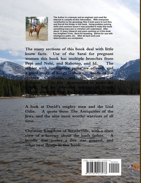 The book has a multitude of truths based on genealogy research. Things that might not make sense when verses are read are easily explained with charts. Sefriot Rebecca's Cousins Saria Nineveh (Sumatrian Dieties) Line from Adam to Noah Line from Noah to Abraham Kings Israelites David's Mighty Men Descendents of Nathan and Solomon The Knight The Zealots and Much More Using the internet and everyones contributions this book is the culmination of compiling all that information in the genealogy databases pertaing to everyone.
